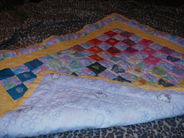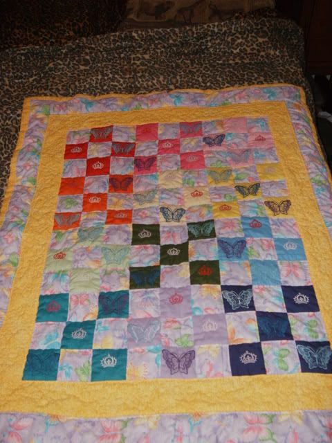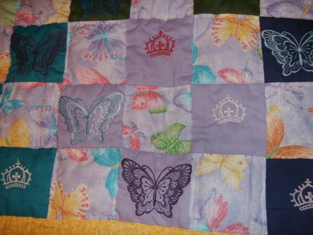 I told my good friend Amber that I'd make her a baby quilt for her newest child. (This will be her #3 and another girl.) I felt bad I never made a quilt for Amber, so this one had to be special. I agonized over what to make of the quilt(pattern and such) and I finally decided on a 9 patch, seeing as I'm almost an expert on making that pattern. I've made a couple other quilts before, but never quite made the whole thing. I always had to get my mom to do the binding, but I even did the binding on this quilt. I've been working on the quilt for quite some time and I finally finished it! I used a really pretty butterfly fabric and 12 solid colors and I embroidered crowns and butterflies into the solid colors. I found a pretty yellow for the inner border, I used the same yellow for the binding. I just love the color combination! I quilted(yes hand quilted) the butterfly squares and the yellow border. I actually just traced the patterns of flowers from the back fabric(Hello Kitty) with the thread. It's beautiful, and I hope Amber likes it. :) I can't wait to see what she'll say!